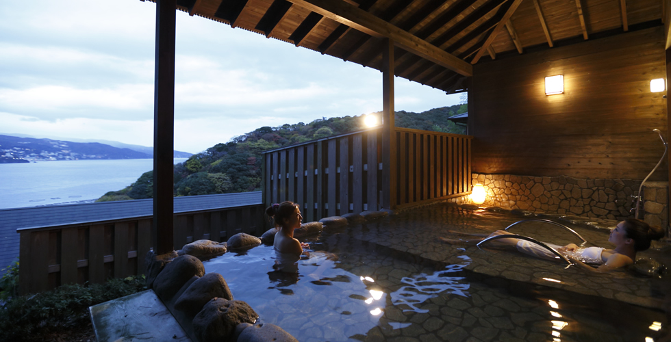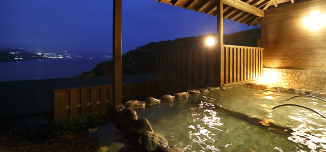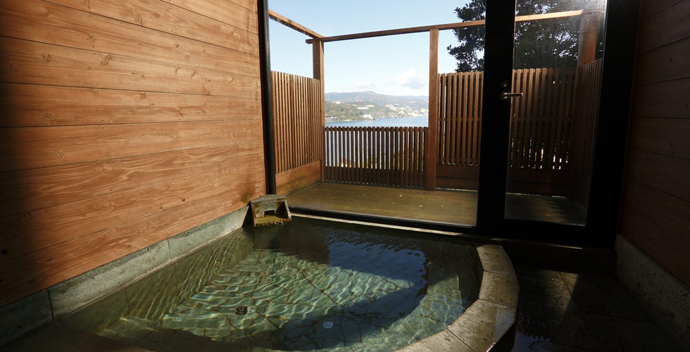 マイナスイオンたっぷりの森林浴と絶景の景色が楽しめる貸切露天風呂の夕月は伊豆石の露天風呂(テラス設置あり)2~3名は入浴可能。