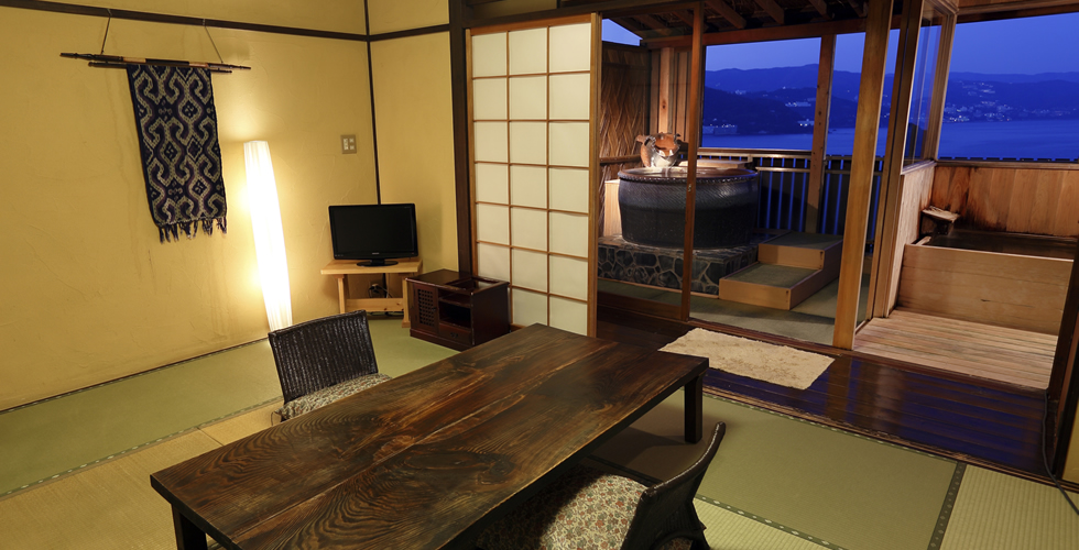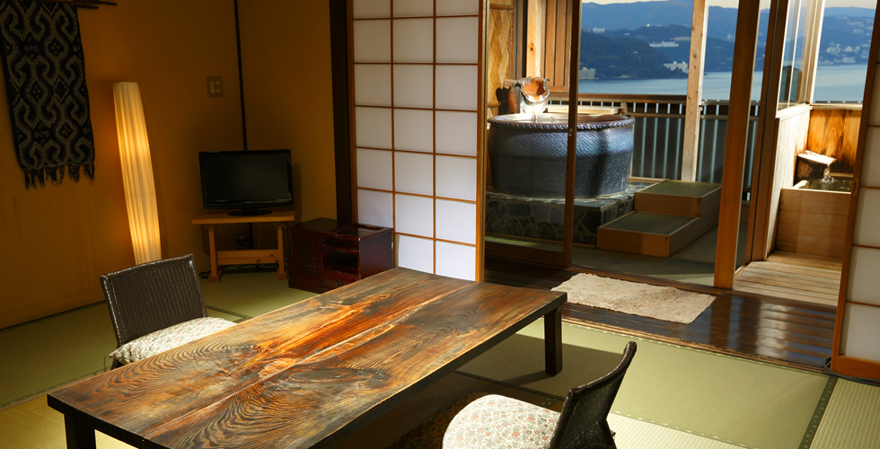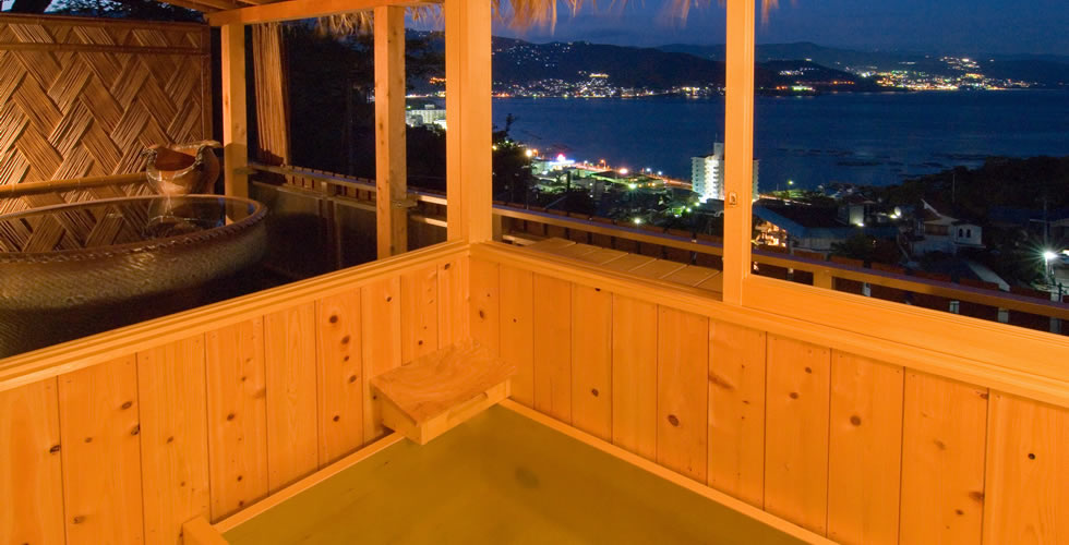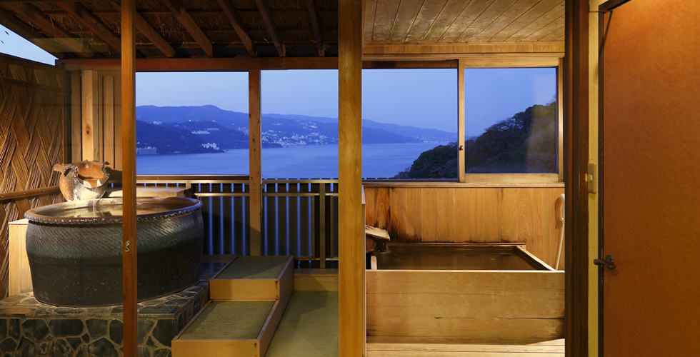 露天風呂(信楽焼陶器)展望内湯(桧の内風呂)
