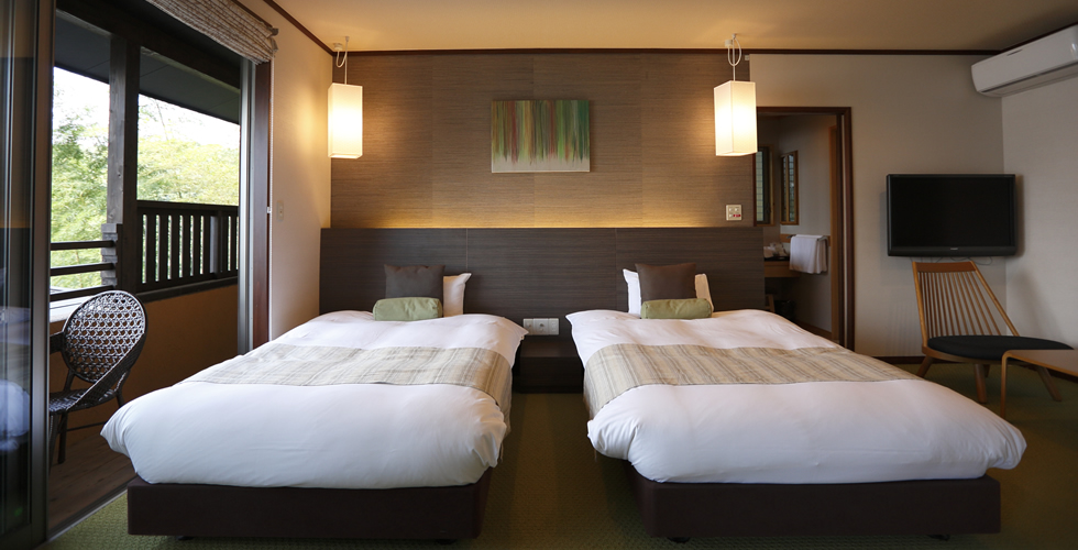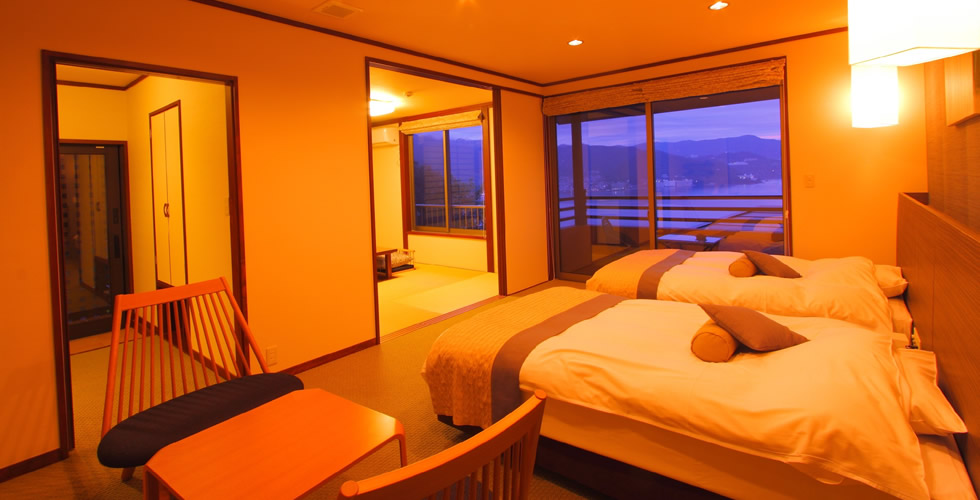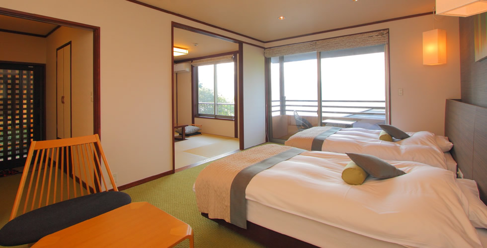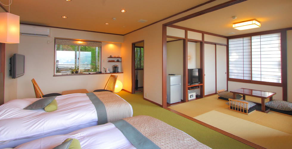 和室6畳(堀炬燵式で足が下ろせます)+洋室12畳 テラス(デッキチェアー有)、和風モダンのデザイナー客室