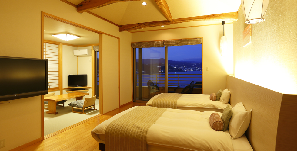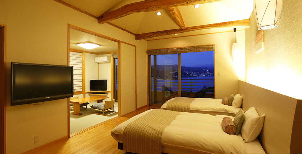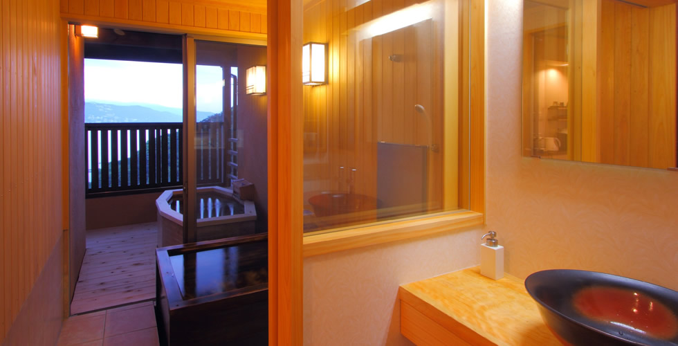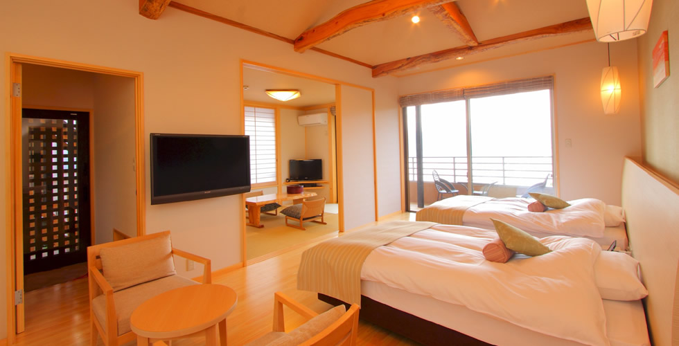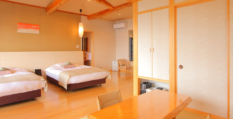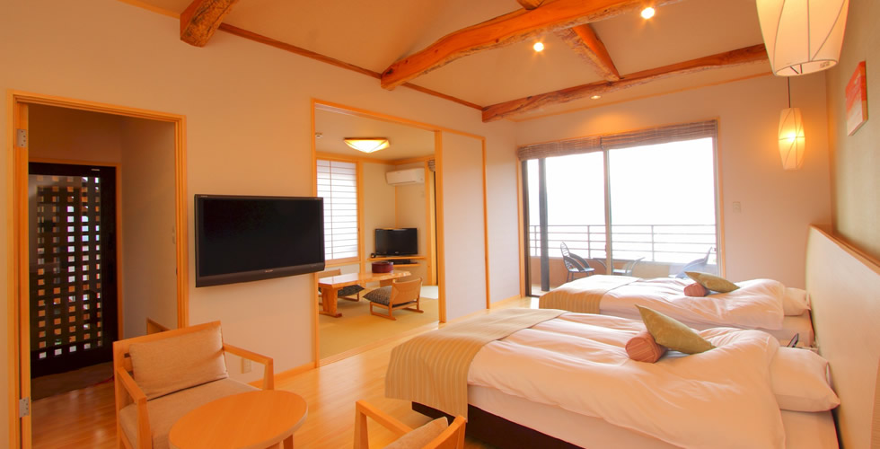 和室6畳+洋室14畳広々テラス付(露天風呂&展望内湯付、サウナ完備) デザインは木を基調にしたナチュラルデザインで優しい色使いです。